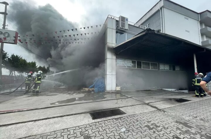 Trabzon'un Akçaabat ilçesindeki hırdavat ve yapı gereçleri alışveriş merkezinde sabah saatlerinde çıkan yangına itfaiye...